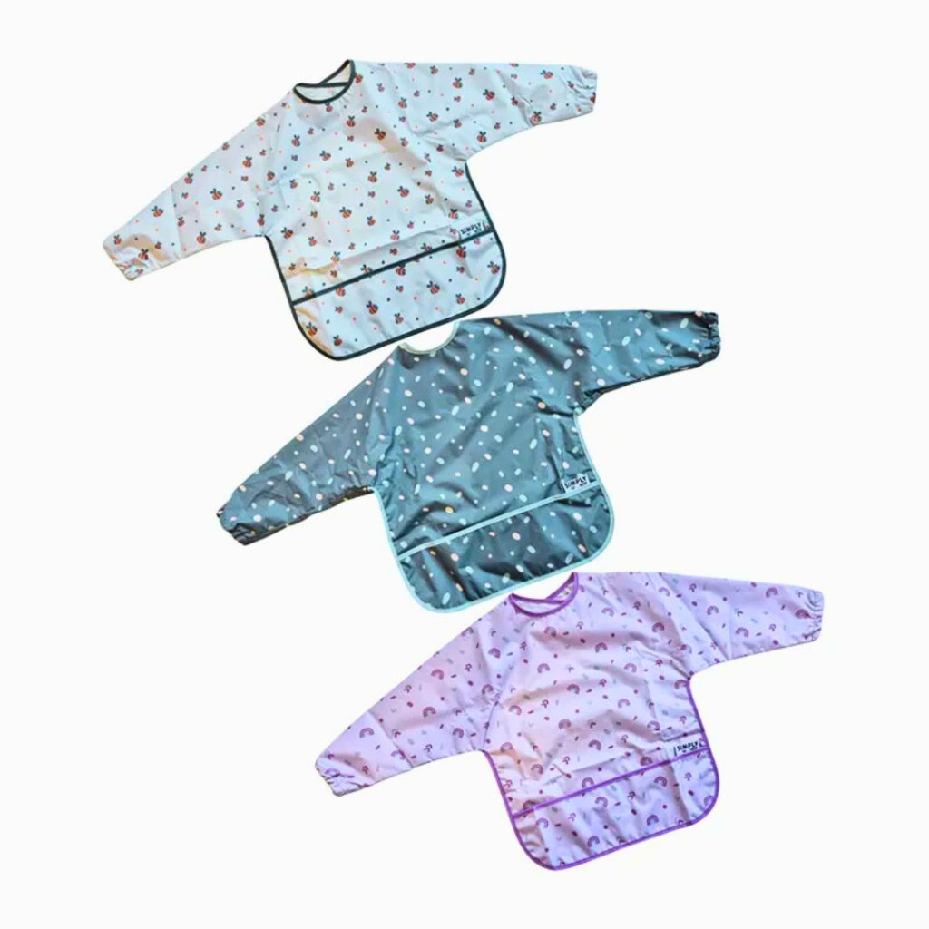Simply Tidy Tot navlékněte dítěti na rukávy a zapněte nastavitelné zapínání za krkem tak, aby bryndák dobře seděl. Kapsičku na spodním okraji rozložte, aby zachytávala spadlé kousky jídla nebo lžičku. Bryndák skvěle funguje při jakémkoli způsobu zavádění pevné stravy – ať už metodou BLW, klasickými kašičkami nebo kombinací obou přístupů. Hodí se i jako ochrana oblečení při malování, modelování nebo jiných kreativních aktivitách.