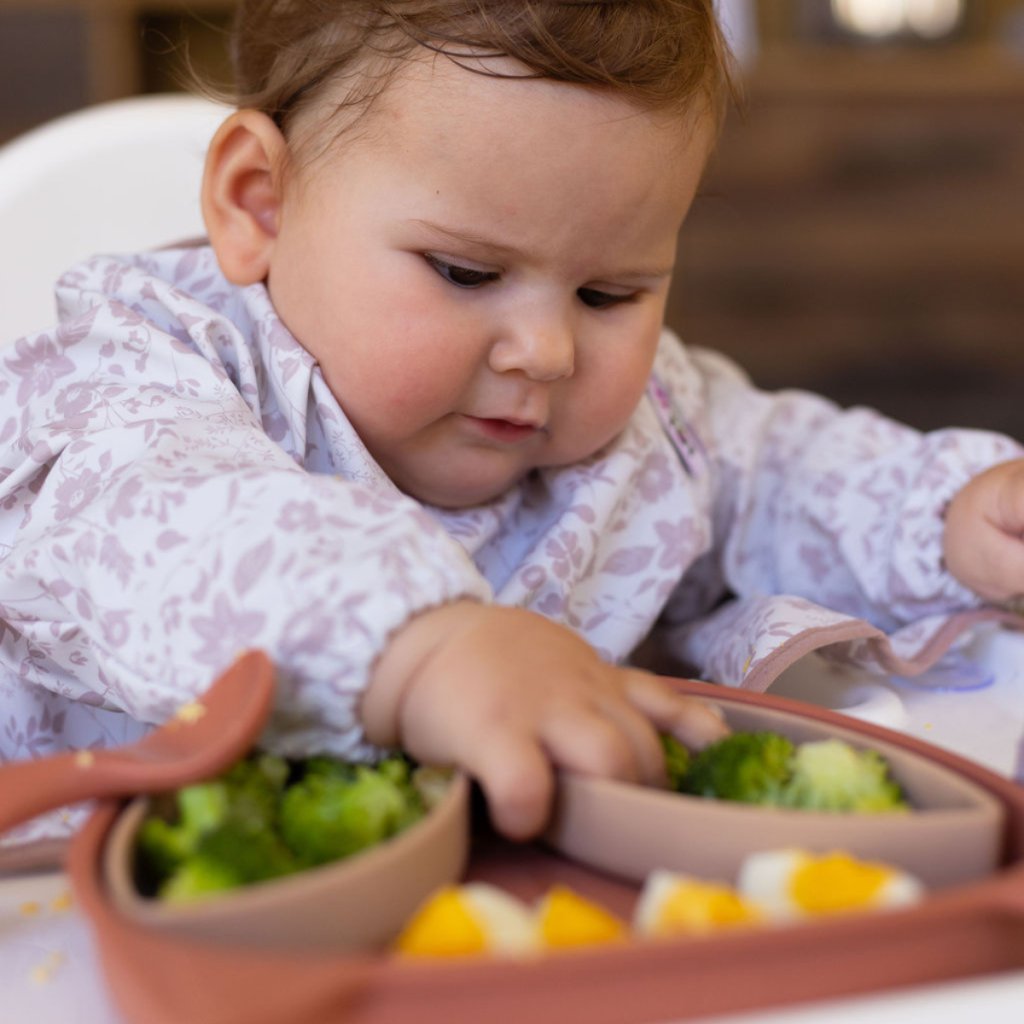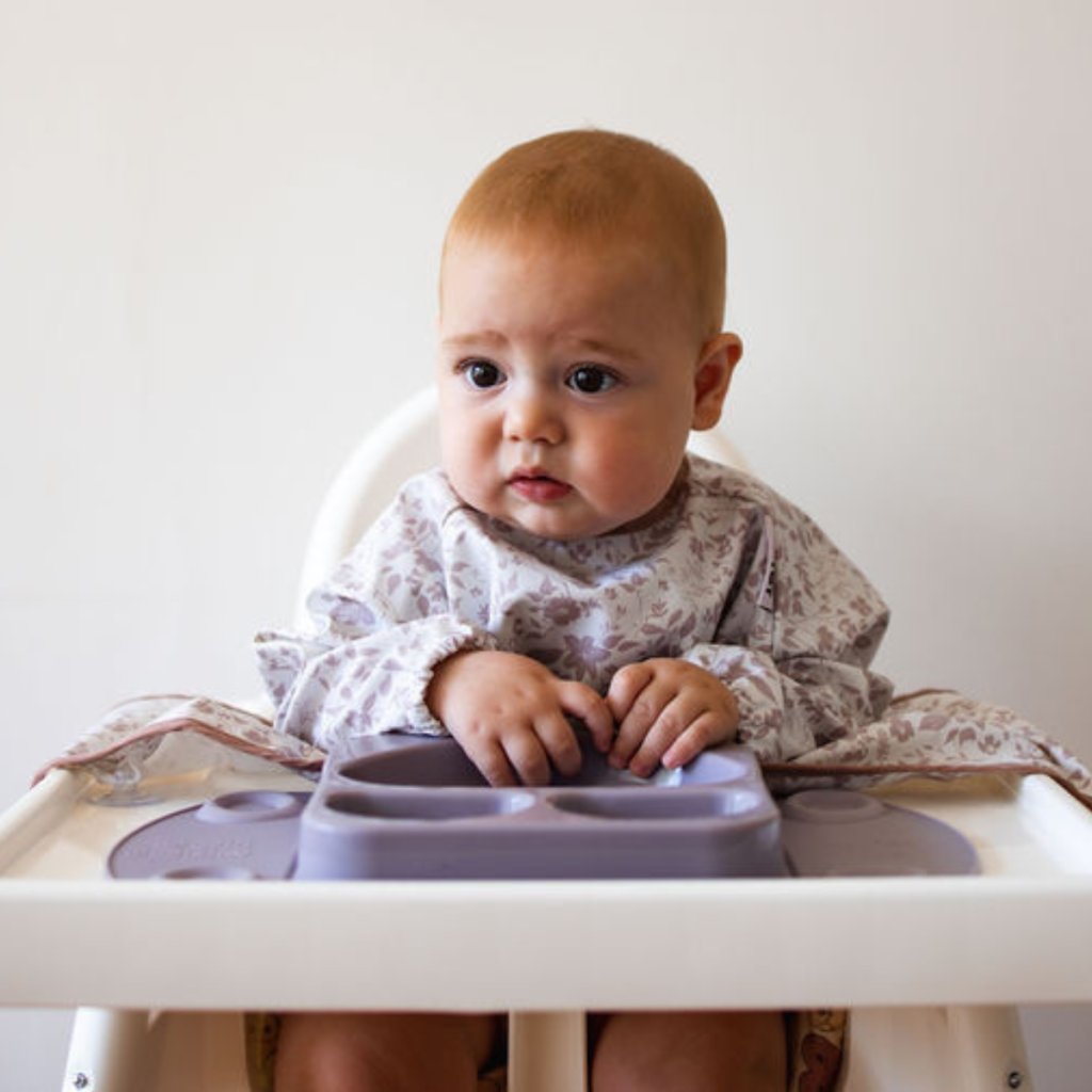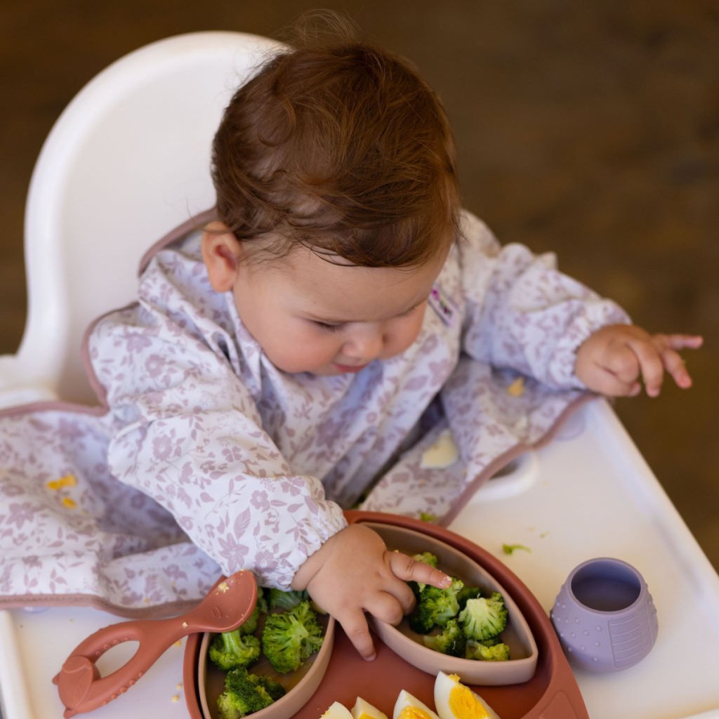 Kompaktní bryndák Cover & Catch značky Tidy Tot je ideální pro stravování metodou BLW i senzorickou hru.