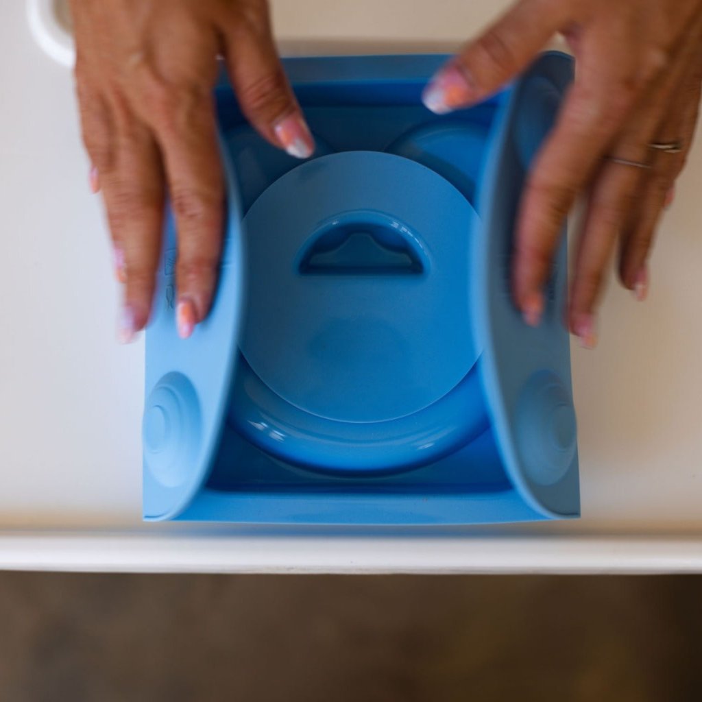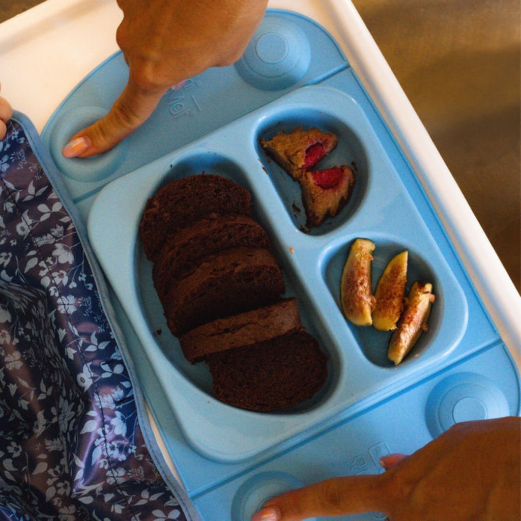 Silikonový talíř Easy Mat s přísavkami a termo taškou – ideální pro první příkrmy, BLW i jídlo na cestách. Přísavky drží talíř pevně na stole nebo na jídelním pultíku, 3 přihrádky podporují objevování chutí a samostatné jezení.